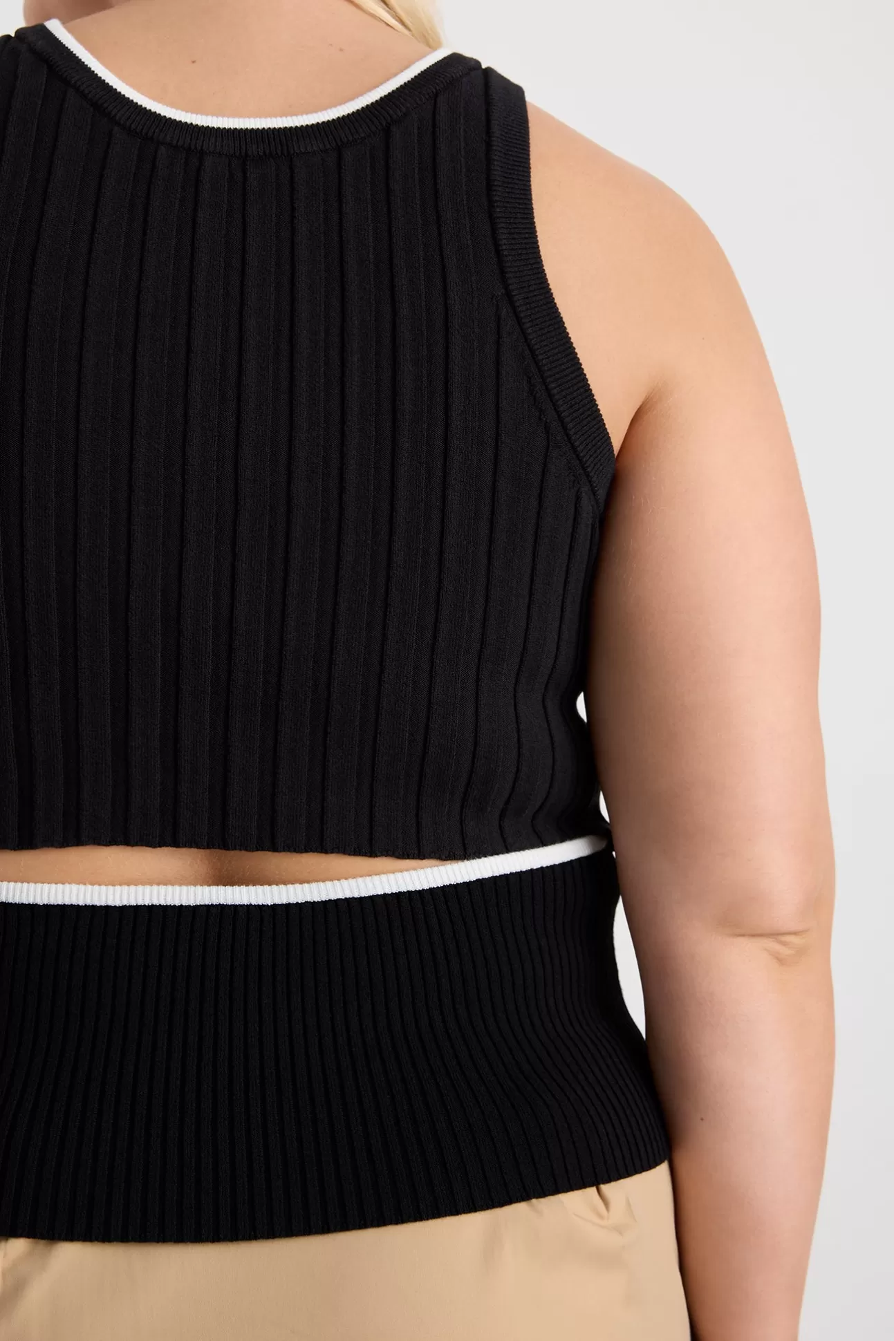 Rib Knit Tank TopSlim FitRacer NecklineContrast Neck And Back TrimBack Waist Cut Out With Contrast Trim